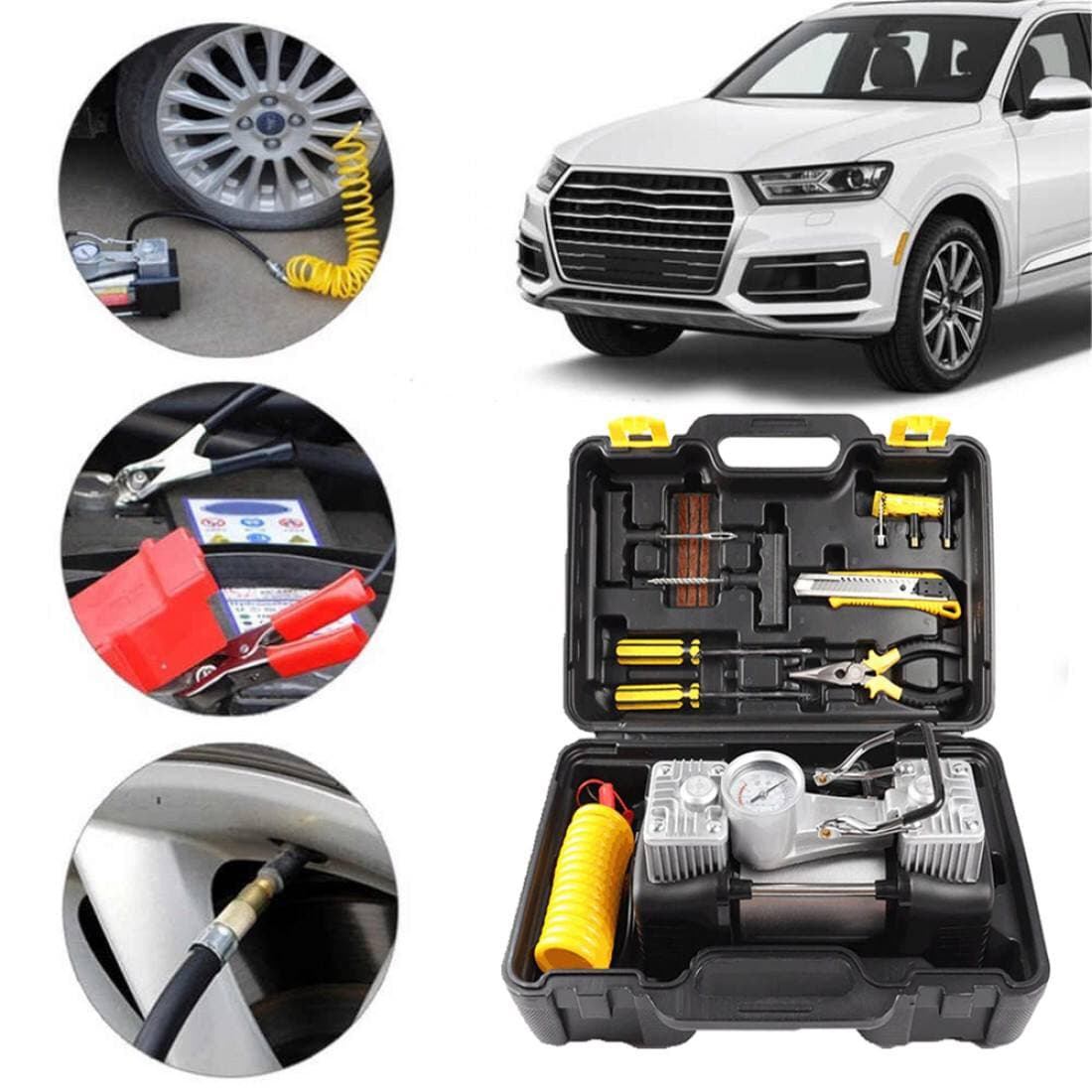 Този професионален комплект е незаменим за всеки автомобил! Здрав, мощен и готов за действие във всяка ситуация. Изграден за надеждност, комплектът включва двуцилиндров компресор с метален корпус, маркуч, инструменти и аксесоари – всичко подредено в удобен преносим куфар. 🧰