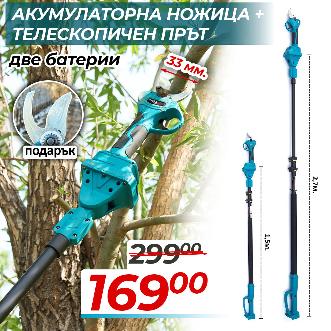 ✔️ Телескопичен прът – до 2.7 м (резане на високи клони без стълба)