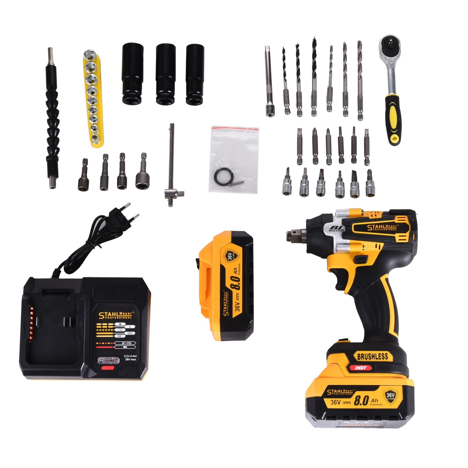 Ударен Гайковерт – Винтоверт 36V 8,0AH STAHLMAYER + 40 части инструменти Акумулаторен Безчетков 2х Батерии 850Nm