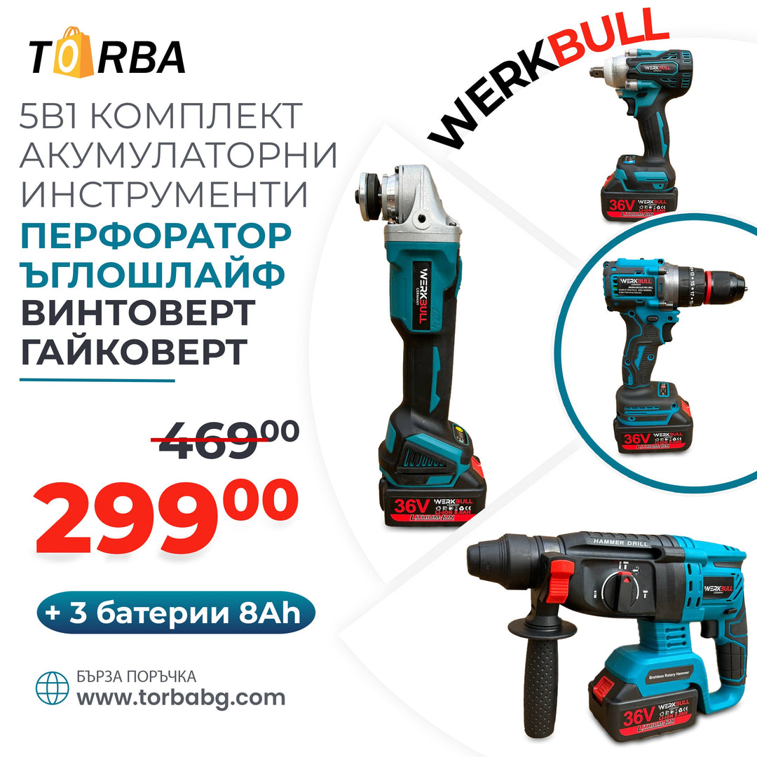 Промо комплект WerkBull Перфоратор, гайковерт, ъглошлайф и винтоверт + 3 батерии 36v 8ah