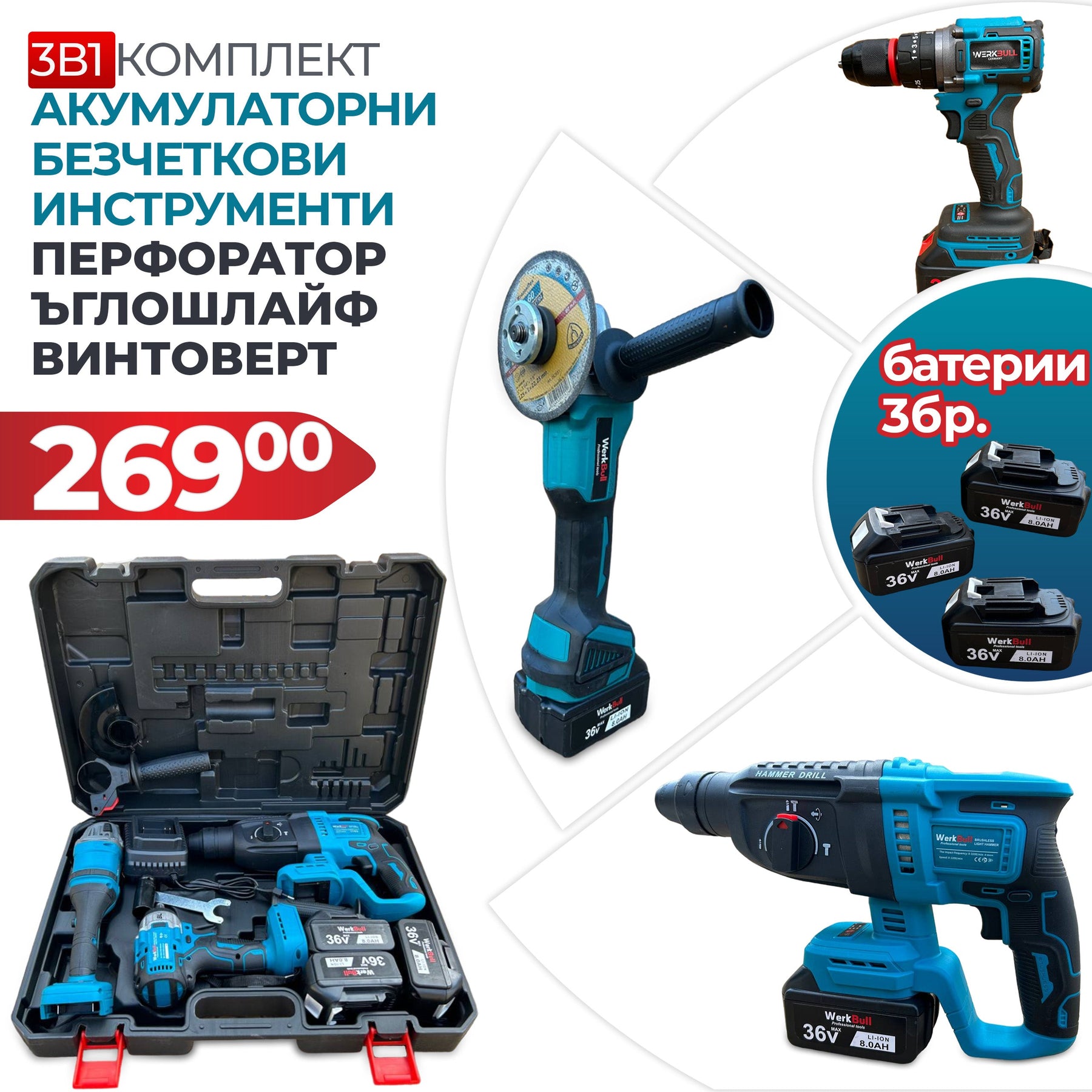 Вземете най-мощния и универсален комплект на WerkBull Germany – три професионални машини + 3 батерии, събрани в един удобен куфар! 💼⚡