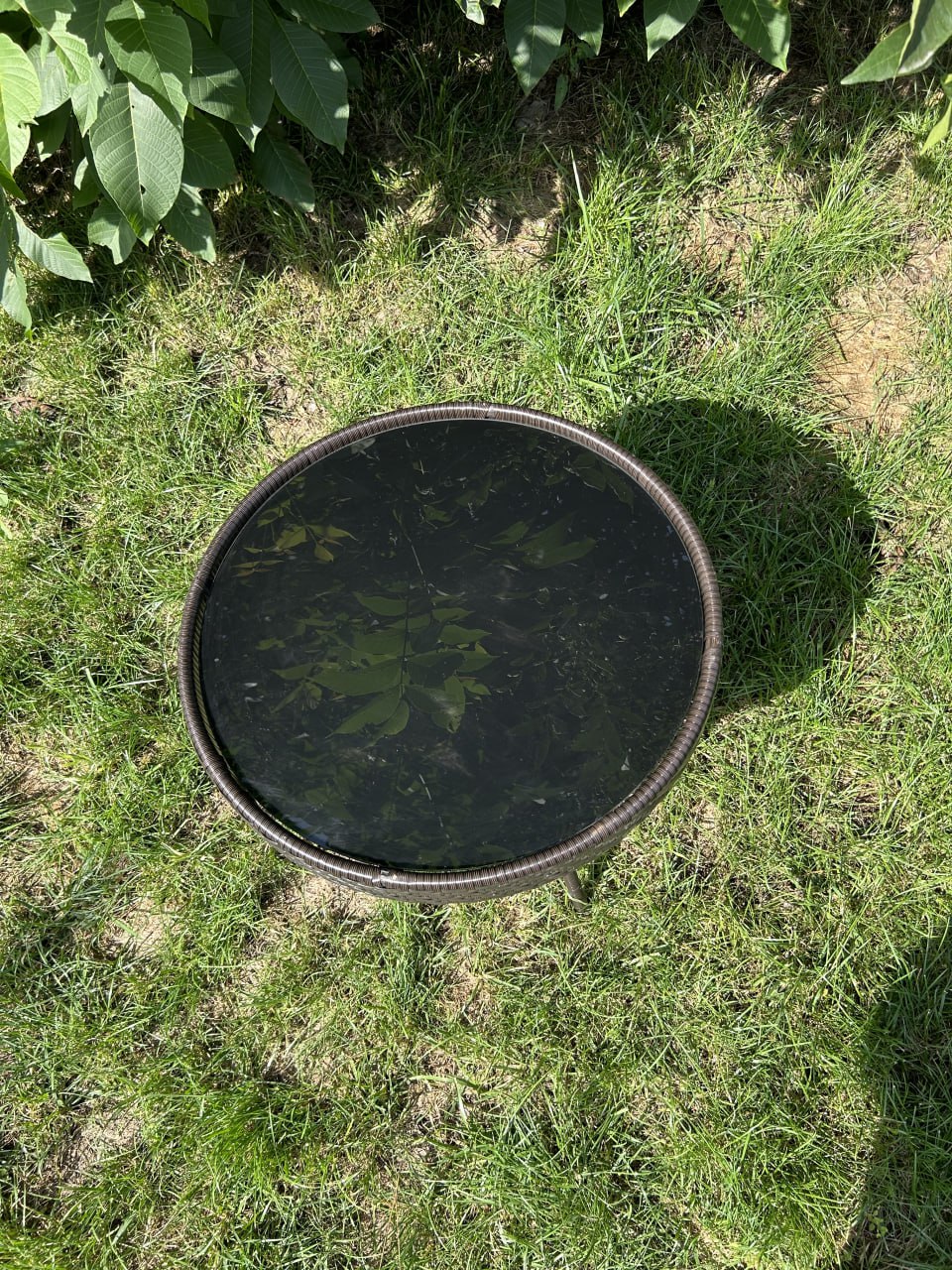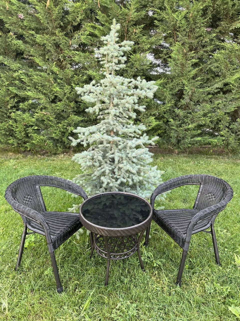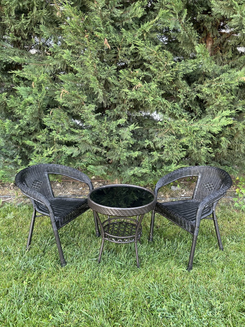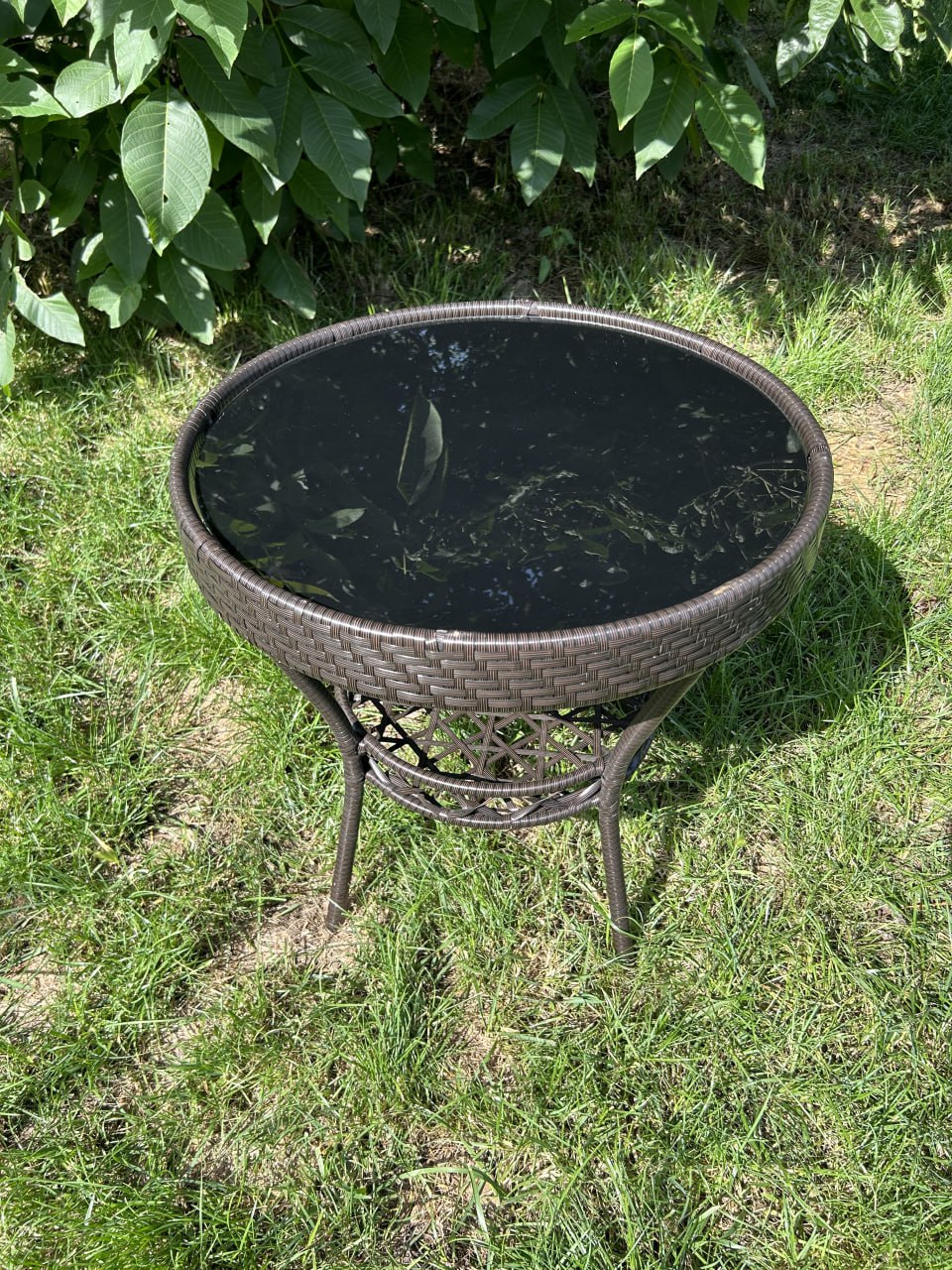 Комплектът включва красива кръгла маса със закалено стъкло + 2 стабилни ратанови стола с подсилени крака, създадени за максимална надеждност и удобство.