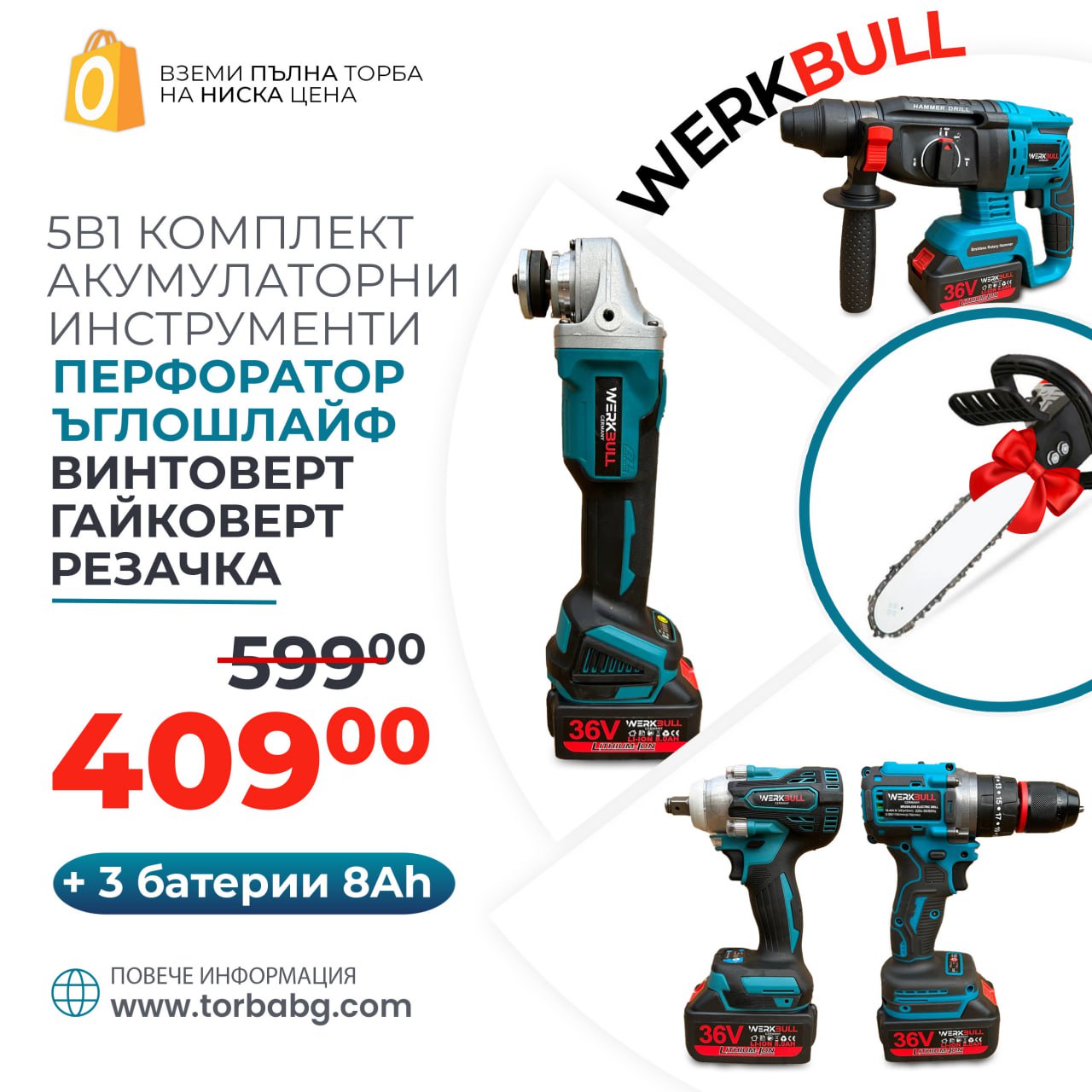 5в1 Немски Комплект WerkBull от Резачка, Гайковерт-Винтоверт,Перфоратор,Ъглошлайф и Винтоверт +3 Батерии 8Ah и Чанта за съхранение