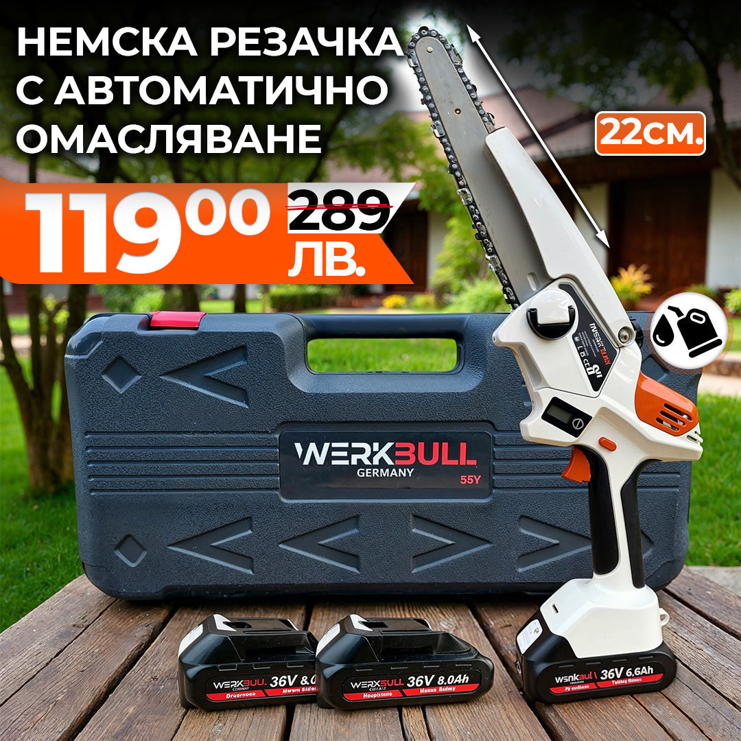 Акумулаторна Безчеткова резачка с омасляване WerkBull с две батерии + подарък верига