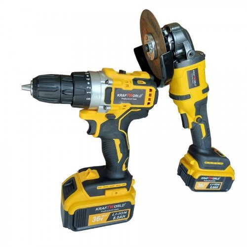 Промо Комплект Ударен Винтоверт и Безчетков Ъглошлайф 36V 8Ah + Подарък Прободен Трион и Приставка Резачка
